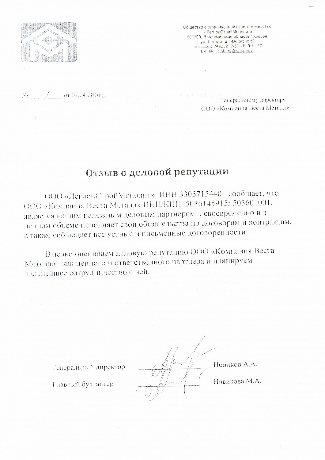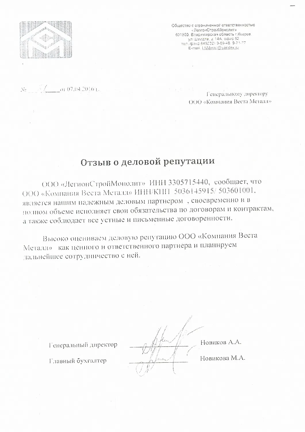 ООО "ЛегионСтройМонолит" ИНН 3305715440, сообщает, что ООО "Компания Веста Металл" ИНН/КПП 5036145915/ 503601001, является нашим надежным деловым партнером, своевременно и в полном объеме исполняет обязательства по договорам и контрактам, а также соблюдает все устные и письменные договоренности.