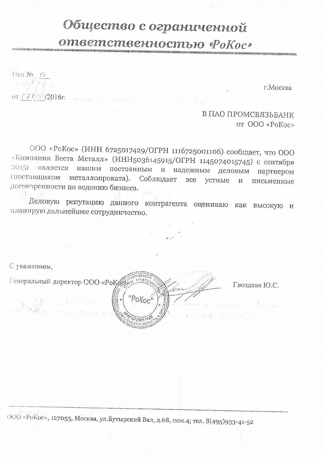 ООО "РоКос" (ИНН 6725017429/ОГРН 1116725001106) сообщает, что ООО "Компания Веста Металл" (ИНН5036145915/ОГРН 1145074015745) с сентября 2015г. является нашим постоянным и надежным деловым партнером (поставщиком металлопроката). Соблюдает все устные и письменные договоренности по ведению бизнеса.